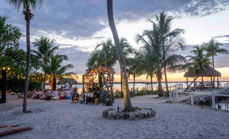 White-sand pathways, hand-carved stone statues, lush tropical foliage, and a glowing waterfront infinity pool create a romantic, timeless backdrop. Every corner of Largo photographs like a dream.